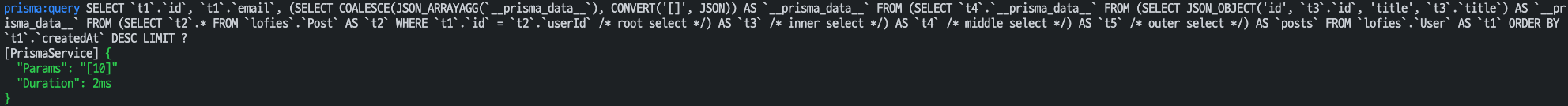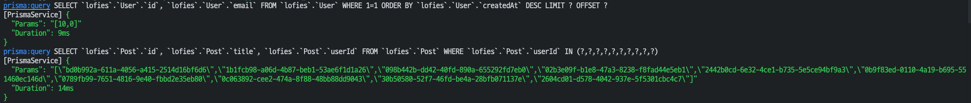 prisma의 쿼리 이벤트를 출력해보면 Batch size를 사용하여 N+1문제를 회피하고 있음을 알 수 있다.